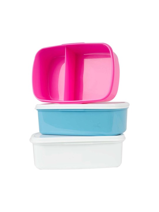 Lunchbox met bedrukbare deksel inzet. Verkrijgbaar in de volgende kleuren: blauw, roze, wit. Een stevige scheidingswand verdeelt de lunchbox in twee compartimenten. Afneembare, witte deksel. Inclusief witte aluminium plaat voor sublimatie. De gesublimeerde aluminium plaat wordt met dubbelzijdig plakband op de deksel bevestigd.