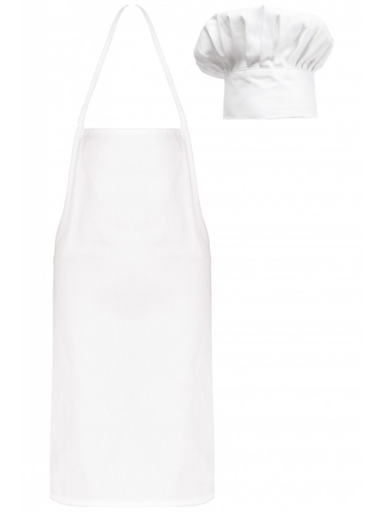 100% katoen. Set bestaande uit een koksmuts en een schort. Regelbare koksmuts dankzij klittenband. Gecertificeerd STANDARD 100 by OEKO-TEX®N° CQ1007/8, IFTH.