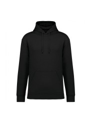 100% biokatoen. Gekamd katoen. Rechte snit met afhangende schouders. Enzymgewassen. Geborstelde fleece 3 draden. Halvemaan op de achterkant. Kangoeroezak. Gevoerde capuchon in de hoofdstof. Stiksel rond de capuchon om het koordje door te rijgen. Plat koordje in biologisch katoen met een sierstiksel. Toon-op-toon nektape van jersey. Afwerking mouwuiteinden en onderkant met 1x1 ribboord, buisvormige montage voor een betere afwerking. Enkel stiksel aan de opening van de zak.