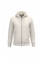 85% biologisch katoen / 15% post-consumer gerecycled polyester. Product met sherpavoering in ecru op alle kleuren: capuchon, mouwen en body. Gekamd katoen. Rechte snit. Enzymgewassen. Ongeborsteld fleece met 3 LST-garens (Low Shrinkage Terry: voorgekrompen fleece). Ritssluiting midden voor van gerecycled metaal. 1x1 ribboord aan de mouwuiteinden en onderaan. De hals is binnenin afgewerkt met ton-sur-ton nektape met kepermotief. Dubbel stiksel aan weerszijden van de armsgaten, de mouwuiteinden en onderaan. Capuchon met 2 panelen en sherpavoering, met stiksel en koordstopper. Kangoeroezak. Ronde aanrijgkoordjes met uiteinden en ringetjes in gerecycled metaal. Drukkersrits onderaan. Halvemaan op de achterkant.