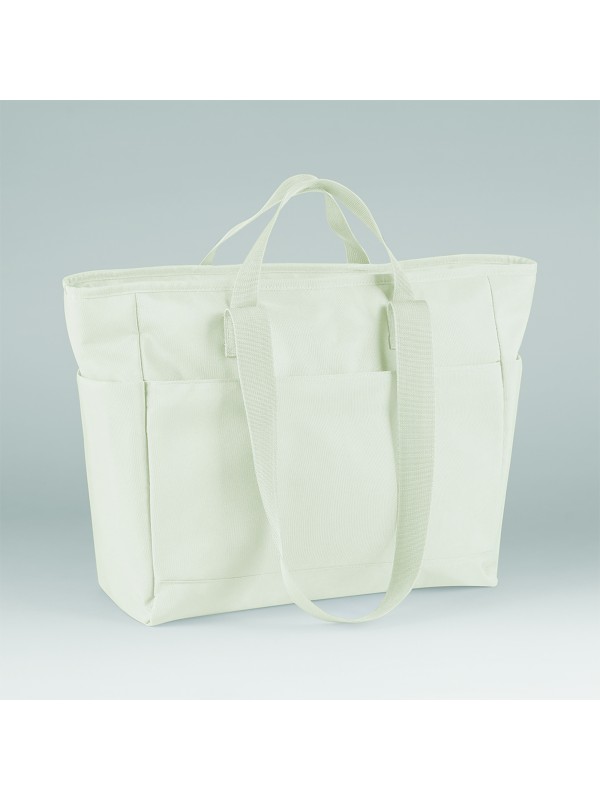 100% gerecycled polyester. Licht gewatteerd voor extra bescherming. Waterafstotende stof. Groot hoofdvak met rits.