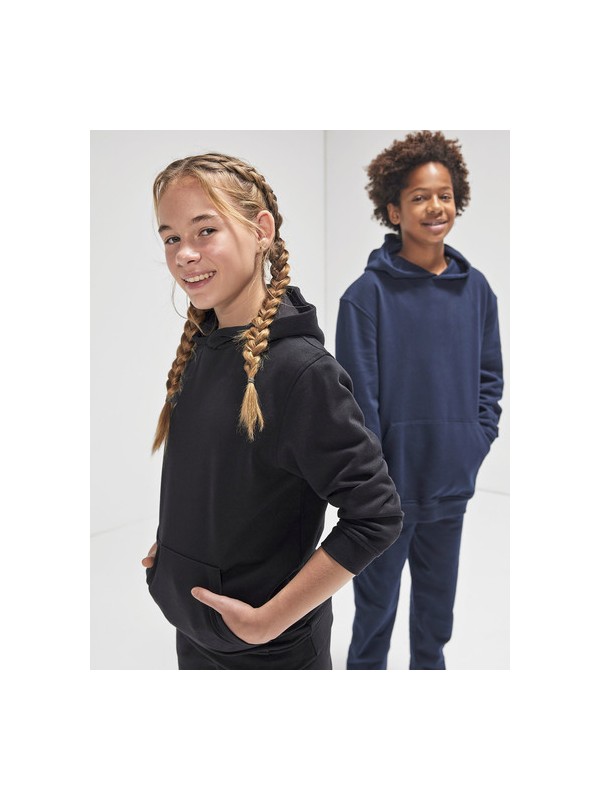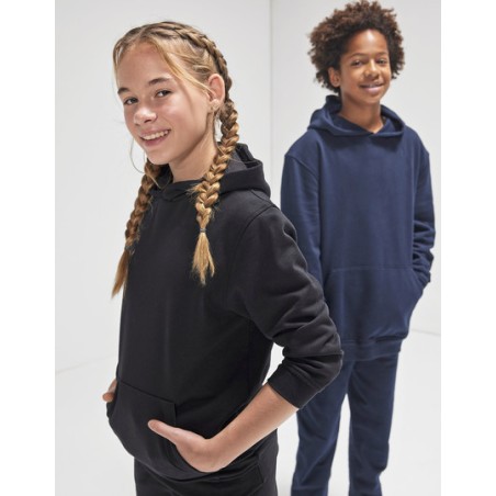 80% voorgekrompen ringgesponnen katoen / 20% gerecycled polyester. Capuchon gevoerd met enkelzijdig jersey. Kangoeroezak. Geen trekkoord voor extra veiligheid. Klassieke boorden en onderzoom in 1x1 elastaan-rib. Zijnaden.