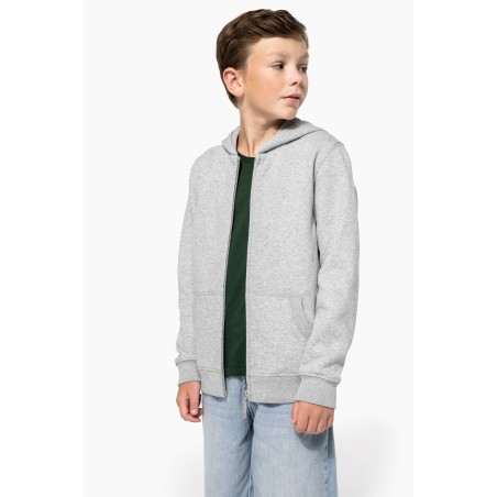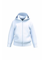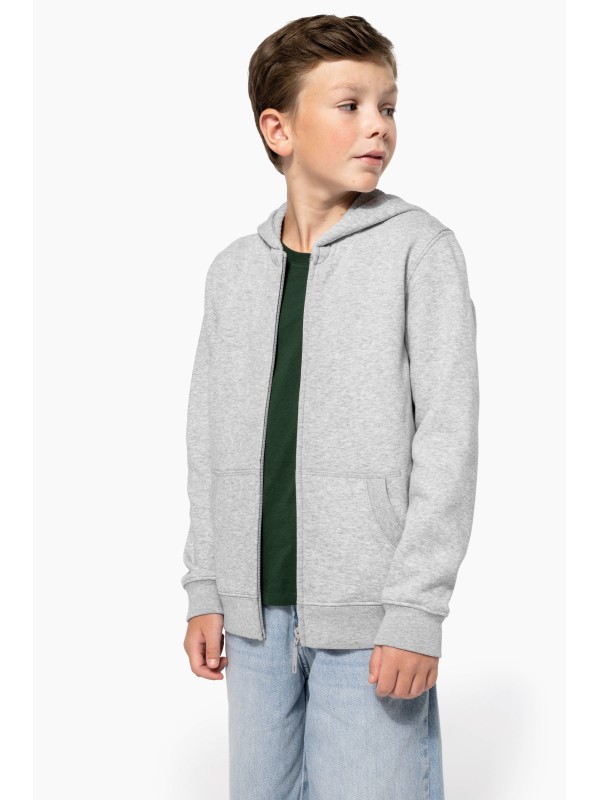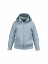 50% ringgesponnen katoen / 50% post-consumer gerecycled polyester. Geborsteld fleece aan de binnenkant. Straight snit. Cut-and-sew. Enzymgewassen. 2x1 ribboord in buisconstructie voor een betere afwerking aan hals, mouwuiteinden en onderkant. Dubbel stiksel aan schouders, mouwinzet, mouwuiteinden en onderaan. Kangoeroezakken. Ton-sur-ton ritssluiting in nylon. Capuchon gevoerd met jersey. Ton-sur-ton nektape van jersey in de hals. Geen label merklabel, maar een maatlabel in de kraag voor eenvoudige personalisatie
