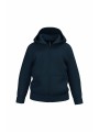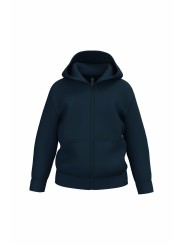 50% ringgesponnen katoen / 50% post-consumer gerecycled polyester. Geborsteld fleece aan de binnenkant. Straight snit. Cut-and-sew. Enzymgewassen. 2x1 ribboord in buisconstructie voor een betere afwerking aan hals, mouwuiteinden en onderkant. Dubbel stiksel aan schouders, mouwinzet, mouwuiteinden en onderaan. Kangoeroezakken. Ton-sur-ton ritssluiting in nylon. Capuchon gevoerd met jersey. Ton-sur-ton nektape van jersey in de hals. Geen label merklabel, maar een maatlabel in de kraag voor eenvoudige personalisatie
