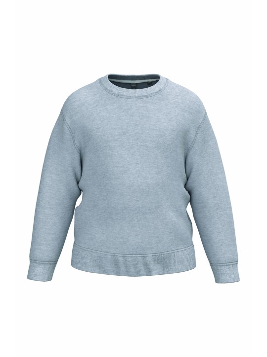 50% ringgesponnen katoen / 50% post-consumer gerecycled polyester. Geborsteld fleece aan de binnenkant. Straight snit. Cut-and-sew. Enzymgewassen. 2x1 ribboord in buisconstructie voor een betere afwerking aan hals, mouwuiteinden en onderkant. Dubbel stiksel aan schouders, mouwinzet, mouwuiteinden en onderaan. Ton-sur-ton nektape van jersey in de hals. Geen merklabel, maar een maatlabel in de kraag voor eenvoudige personalisatie.