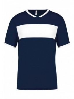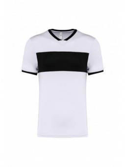 65% polyester / 35% katoen. Gekamd katoen jerseystof. Wasbaar op 60 °C. Anti-pluisbehandeling. Ronde hals met elasthan. Contrasterende bies aan binnenkant kraag en schouders. Mouwuiteinden in ribboord met contrasterend biesje. Afwerking met dubbel stiksel onderaan. Ideaal voor dagelijks gebruik. Gecertificeerd STANDARD 100 by OEKO-TEX®N° CQ1007/7, IFTH.