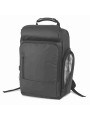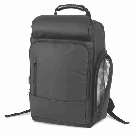 100% polyester. Stijlvolle rugzak met laptopvak tot 15". Groot verticaal voorvak met ritssluiting. Ongevoerde ritszak vooraan voor eenvoudige bedrukking. Twee zijzakken voor drinkbussen. Comfortabele achterzijde in ademend tricot.