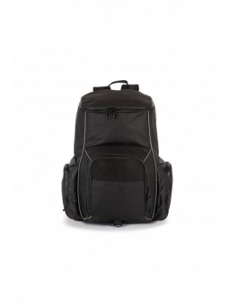 100% polyester. Rugzak met Roll-Top sluiting via een verstelbare gesp. Grote voorste zak voor eenvoudige personalisatie. Veiligheidszak op de achterkant. Gewatteerde schouderbanden. Opbergzakken opzij. Gewatteerd binnenvak voor een laptop en een zak voor accessoires of een tablet. Binnenpaneel vooraan, met opbergzakken en een pennenhouder.