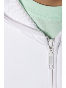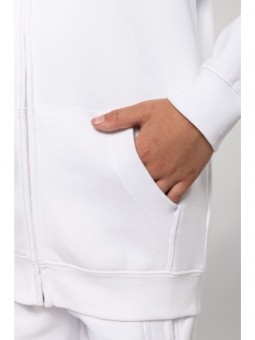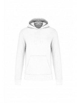 80% gekamd katoen / 20% polyester. Aan de binnenkant geborsteld fleece 3 draden. Fitted pasvorm. Rechte mouwen. Kangoeroezakken. Halvemaanvormige halsopening voor eenvoudige personalisatie van het merk aan de binnenkant van de kraag. Afwerkingen van 1x1 ribboord aan de mouwuiteinden en de boord. Gevoerde capuchon met een themastof in bedrukt jerseykatoen. Tear-away merklabel.
