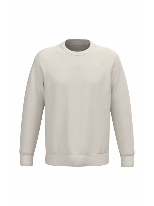 85% biologisch katoen, 15% post-consumer gerecycled polyesterGekamd katoen. Rechte snit. Geborsteld fleece met 3 LSF-garens (Low Shrinkage Fleece: voorgekrompen fleece). Enzymgewassen. 1x1 ribboord aan hals, mouwuiteinden en onderaan. De hals is binnenin afgewerkt met ton-sur-ton nektape in jersey. Dubbel stiksel aan weerszijden van de armsgaten, de mouwuiteinden en onderaan. Halvemaan op de achterkant.